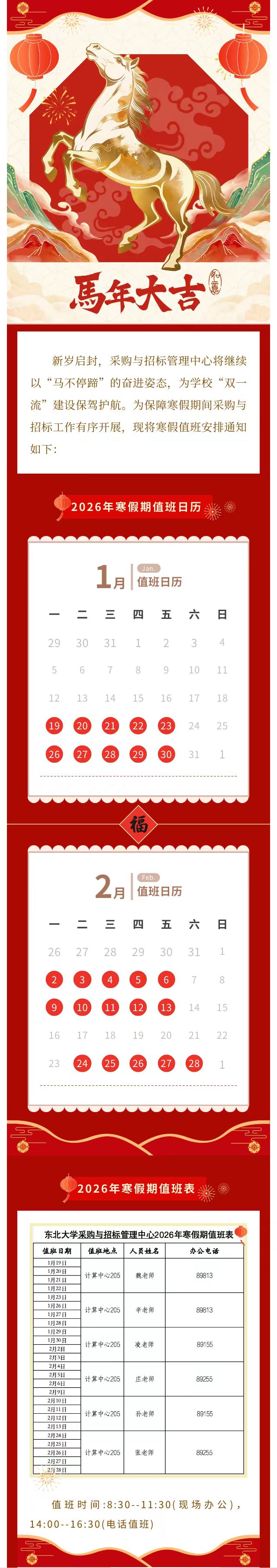 东北大学采购与招标管理中心2026年寒假期值班表